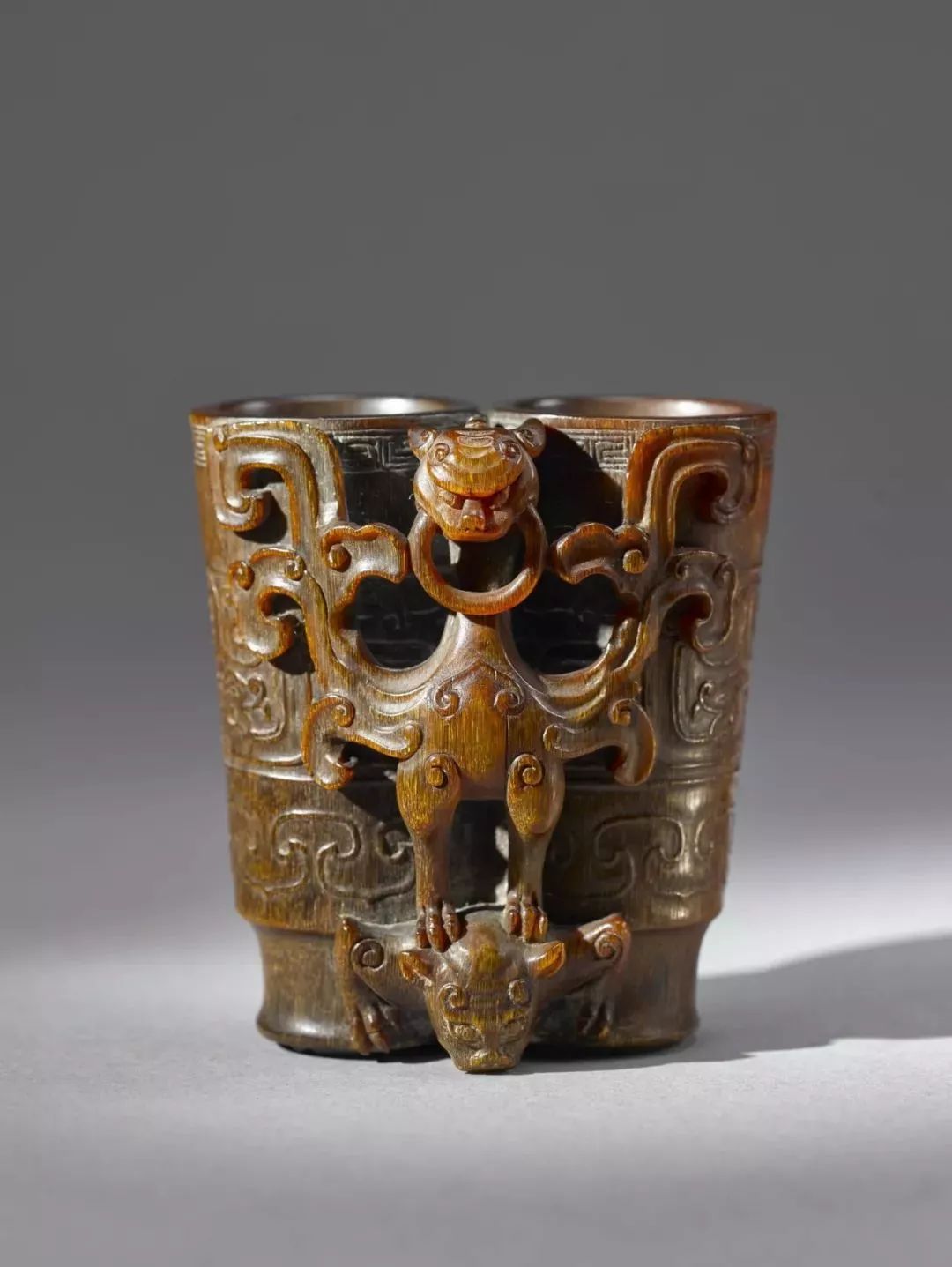 这件合卺杯乃上海博物馆藏,材质是犀角。合卺(jǐn)是古代婚礼上的一种礼仪,始于周代,通俗来说,就是新娘新郎共饮交杯酒。