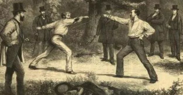 欧洲历史上的决斗分为两种,一种是自古以来的司法决斗,一种就是近代以后掀起的荣誉决斗。司法决斗的历史可以追溯到日耳曼时代和维京时代,司法决斗可是写进了欧洲各国法律的合法行为,威廉征服后诺曼人就把司法决斗写进了法典内。到了近代以后司法决斗因为实在太野蛮被废除,英国最后一次司法决斗发生在1571年,是两户绅士为了争夺地产进行的决斗。 这次决斗还惊动了伊丽莎白一世女王,女王特别规定只要分出胜负即可。不过女王反对司法决斗,却对荣誉决斗报以“真香”的态度。 )