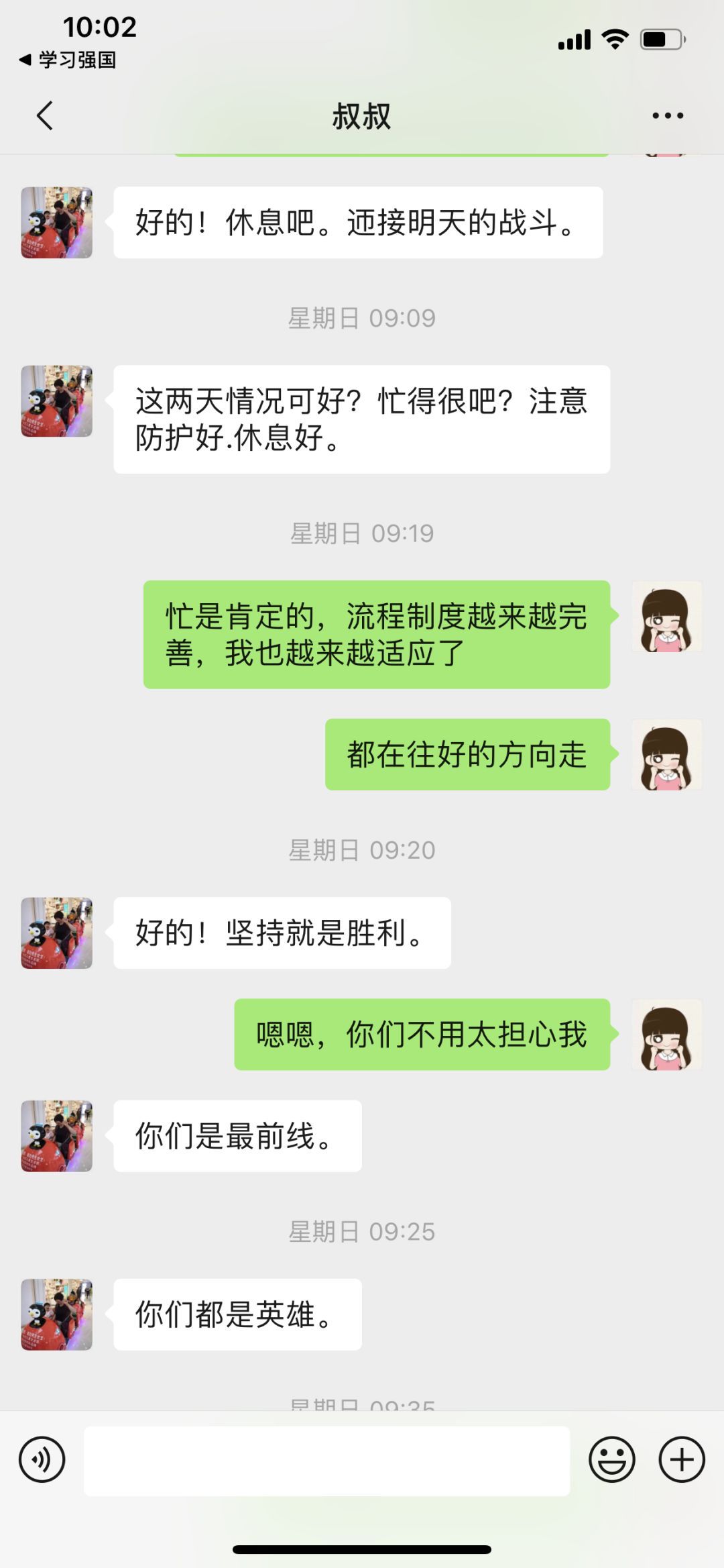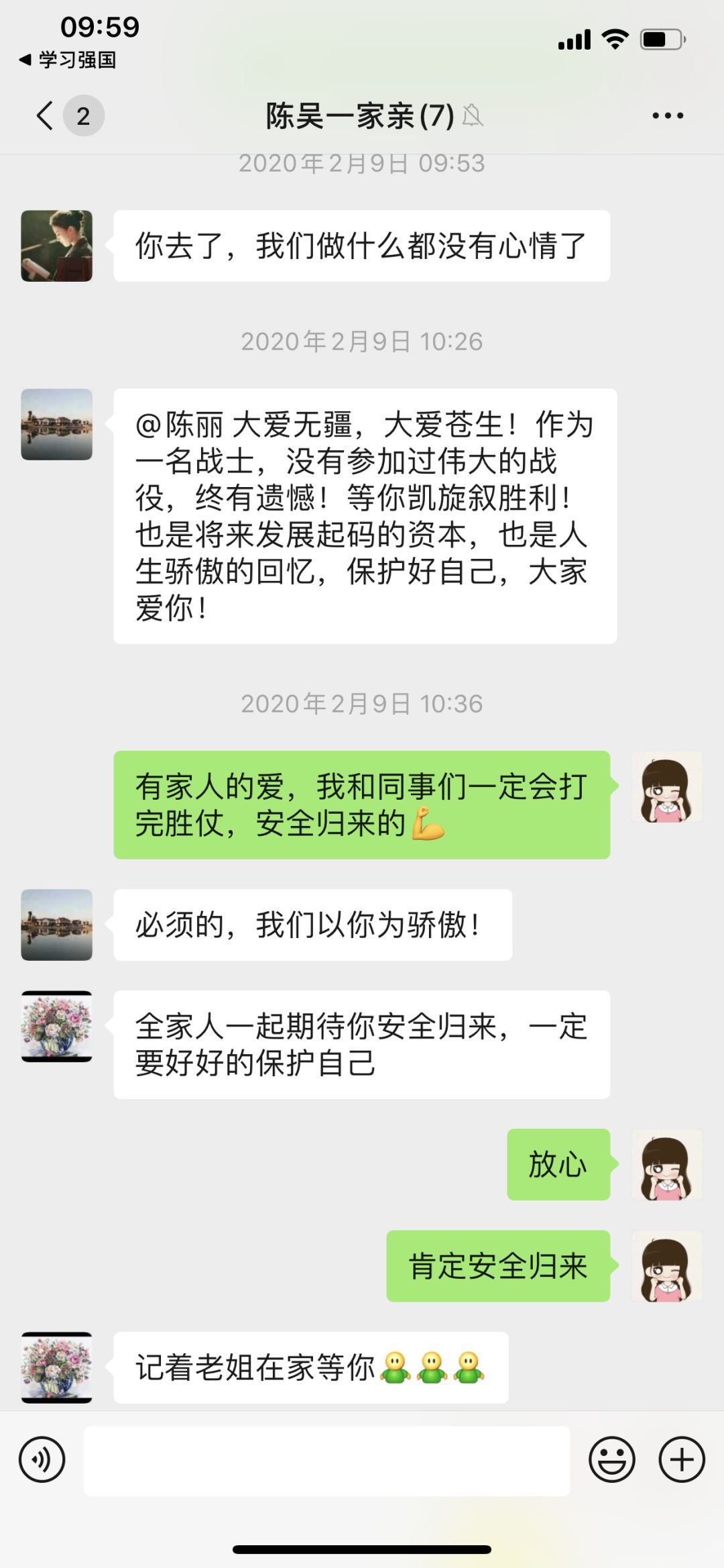正因为如此,在新冠病毒肆虐时,作为一名在爱中成长起来的医护人员和党员,我毫不犹豫的加入这场战争,承担起白衣战士的职责和使命。2月9日,在报名四次后,我终于踏上驰援武汉的征程。来到这里之后,每天都能收到无数的关心与慰问,大后方的保障更是无微不至。我也从最初的激动、兴奋和紧张,逐渐平缓了心情,越来越能适应抗疫前线的工作和生活节奏。前线后方的爱像阵阵暖风拂过心头,隐约间闻到了春天的气息,让我每天都充满着活力和动力去学习去战斗,在这里,我有许多话想对你们说—— To:亲爱的家人 亲爱的姐姐,首先要跟你说一声对不起,瞒着你报名来到武汉,我知道你是担心我的身体。在你知道后,你还是一如既往支持我的任何决定。也请你放心,我一定会照顾好自己,和战友们一起打赢这场战役平安回来的。我相信你会像叔叔和哥哥说的那样,为我自豪,为我高兴。你们说,我是你们心目中的英雄。我也向你保证,以后一定乖乖地听你的话,不再那么任性。你们在家也要听我们医院张爸的话,做好防护,不添乱。