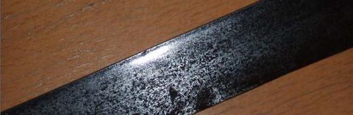 镔铁这个词在中国词汇中表述还是挺模糊的。古代中近东、南亚有花纹的刃器大致分为两大类:一种以乌茨(Wootz)钢为原料制成;一种以高碳钢和熟铁叠打而成。不得不说中国史籍在对镔铁这个词的描述中,混淆了渗碳结晶钢和人工锻焊钢的区别。原因在于当时有的引进的是制成品,有的引进的是原料钢材。《魏书》卷102《西域传》说:波斯国(今伊朗)出镔铁。我个人认为是经坩埚渗碳,高温熔化后的材料钢。唐代僧人慧琳《一切经音义》卷55认为镔铁出于罽宾(今克什米尔)等外国,又说镔铁“以诸铁和合,或极精利铁之上者”,我个人认为是人工锻焊的成品。出产地域方面还有出自大食国等说法,总之,所谓的镔铁的分布在西域地区有一定的广泛性。镔铁约在南北朝时传入中国。此后中国也掌握了制炼人工锻焊镔铁的技术。镔铁主要用来制作刀剑,花纹堆累,绚丽多姿。至于锋不锋利,好不好用,和开刃角度及刃器姿形有关。笔者旧藏清代人工锻焊刀局部照片: