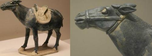 图为国家博物馆藏蓝釉驴及局部图(驴带无衔铁笼头而不是马辔):