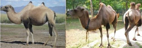 双峰驼:中国北方军队中长期使用的双峰驼也是外来驯化引进物种。家养双峰驼驯化时间的推测约为距今4500年前,其驯化地点相关的证据主要集中在伊朗北部和土库曼斯坦南部等地区。野生双峰驼种群主要分布在亚洲及周边较为凉爽的地区,如蒙古国、中国、哈萨克斯坦、印度北部以及俄罗斯,驯化种群目前分布在中亚的一些国家,如土库曼斯坦、哈萨克斯坦、吉尔吉斯斯坦、巴基斯坦北部和印度的荒漠草原,向东可延伸到俄罗斯的南部、中国的西北部、蒙古的西部。然而现代分子遗传学的研究彻底打破了此种说法;吉里穆图等对家养双峰驼和现存野生双峰驼的线粒体细胞色素b基因序列进行了分子遗传学分析,表明家养双峰驼和现存野生双峰驼没有直接的关系,属于不同的母系起源,且两个亚种之间的分化可能发生在70万年前。野骆驼(左)和家畜骆驼(右),清注意驼峰的区别: