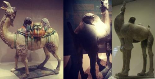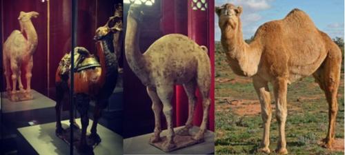 单峰驼:单峰驼原产在北非和亚洲西部及南部干燥地区,除个别地区二次野化外并无野生品种,目前单峰驼饲养于阿拉伯、印度及北非。有证据表明在公元前1800年单峰驼就已在阿拉伯被人驯养了。历史上单峰驼也分布在新疆南疆,近代种群数量衰减直至消失。北京故宫陶瓷馆展出的馆藏三彩单、双峰骆驼实物对比图: