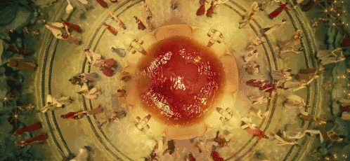 最夸张、最极致的,当属胡玉楼、花萼相辉楼一类纯粹虚构的场景,不仅完全超越了历史真实,并且还将神话、宗教、民间传说等诸多视觉元素悉数囊括其中。比如胡玉楼的屋宇,采用了罕见而新潮的挑空斗拱样式,将水道引入建筑内部,游船可经河渠直抵室内,弃船上岸便可拾阶登楼。花萼相辉楼的内部构造,灵感则来自佛教经变中的极乐世界、七宝楼台和兜率宫,同时融入了道教瑶池、龙宫的造型特点。四周重重叠叠的台阶、楼栏,像是西式歌剧院的观众席,表面再饰以仙山琼阁、九层祥云的造型,让四海来宾,群贤毕至、少长咸集,颇有三界仙佛同赴瑶池盛宴的即视感。为了渲染场面的盛大浮华、穷奢极欲,摄影机多用长镜头跟拍,让观众跟随空海、白居易、晁衡的视线,穿廊过厦,步换景移。中间还不断插入来宾们惊诧、叹服的表情,让观众在视线、心理、情绪上与他们产生认同和共鸣,并与他们一道,化身为大唐盛世万邦来朝、天下归心的亲历者和见证人。