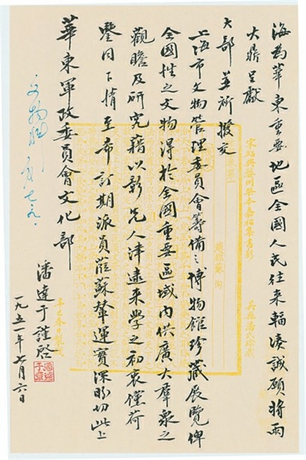 1951年7月,已经从苏州移居上海的潘达于获悉“上海市文物管理委员会正积极筹备大规模之博物馆,保存民族文化遗产,发扬新爱国主义教育”,于是致函华东军政委员会文化部,慨然表示愿将盂、克二鼎捐献,并希望其“拨交上海市文物管理委员会筹备之博物馆珍藏展览,俾全国性之文物得于全国重要区域内供广大群众之观瞻及研究”。