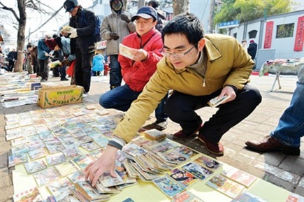 每逢周日,文庙的旧书市场总会人潮涌动,在琳琅满目的摊位上,旧版连环画似乎串起了他们的共性,这一承载几代人记忆的艺术形式“意外”地在这里走红。商贩们的逻辑很简单:“这玩意儿现在赚钱。”的确,在拍卖市场上节节走高的价格,带动着收藏市场的关注点,爱好者、夹杂着投资者,频频驻足。
