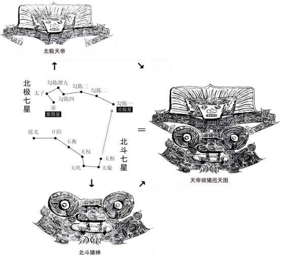 良渚先民把北斗七星围绕北极帝星旋转,想像为北极天帝骑着北斗猪神巡天,创造了精准对应北极天象的良渚神徽:天帝骑猪巡天图。