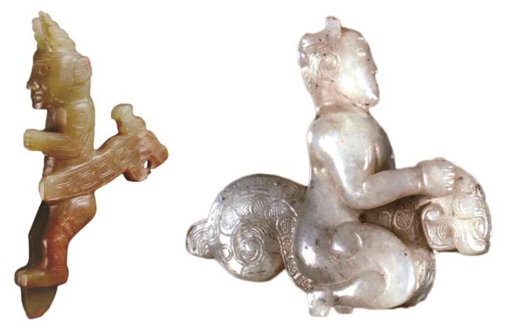 ▲左:天帝骑龙巡天(西周玉器) 右: 天帝骑虎巡天(战国玉器)