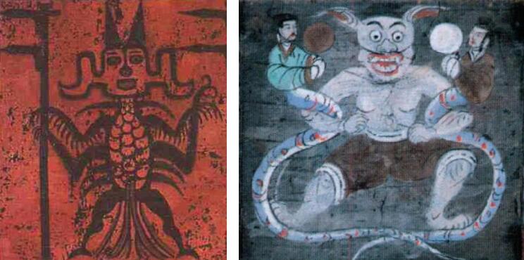 ▲左:天帝乘两龙之车巡天(战国) ▲图:《山海经》插图(明代)