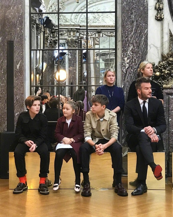 毫无意外的,秀场最显眼的位置上坐着贝克汉姆一家人。在这十年中,这一家人的一举一动都备受关注,他们也已经成为这个时尚品牌的一部分。