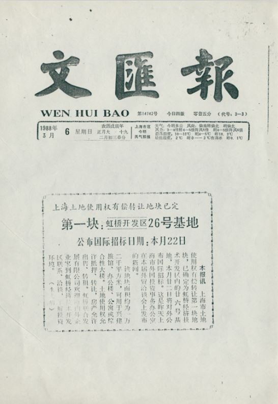 1988年3月22日 上海市举行土地使用权有偿出让发标大会,沪港两地同时向全球发放虹桥经济技术开发区第26号地块土地使用权有偿出让国际招标书。