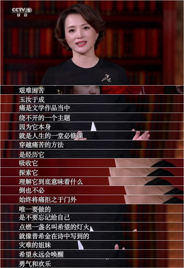一切,如董卿在节目结语时说的,“艰难困苦,玉汝于成。痛,是文学作品当中绕不开的一个主题,因为它本身就是一堂人生的必修课。穿越痛苦的方法,是经历它、吸收它、探索它,理解它到底意味着什么。倒也不必,始终将痛拒之于门外。唯一要做的,是不要忘记给自己点燃一盏名叫希望的灯火。就像普希金在诗中写道的,‘灾难的姐妹,希望,永远会唤醒,勇气和欢乐。’”