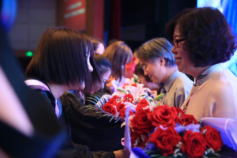 2017届毕业生代表向教师、辅导员、家长、后勤服务部门职工代表献花,表达对深沉伟大的父母之爱、真挚无私的老师之爱的感谢之情。