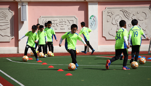 上海的各个学校也开动脑筋,结合学校硬件、软件条件,开设各具特色的校园足球课。一年级小娃娃利用绳梯和跳架练习训练灵敏性,二年级孩子通过绕桩练习脚背内、外侧传接球技术,三四五年级的孩子们则通过分组对抗,增强实战对抗能力……每天放后学3:30-5:00,向阳小学不同年级约60名小学生集合在两片篮球场上,由五位足球专业教练带队训练。