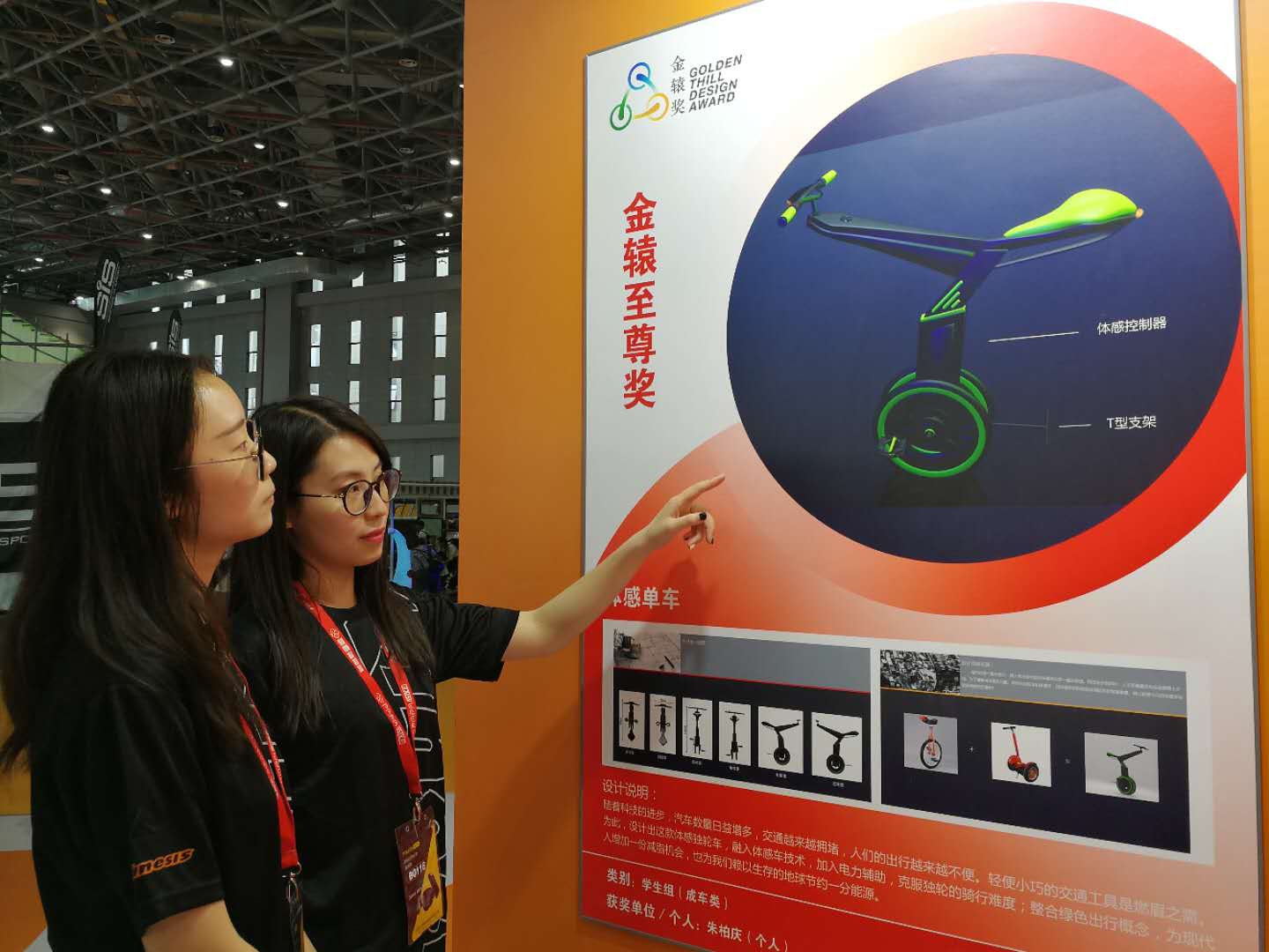经过三轮评审,根据作品的创新程度、设计品质、市场前瞻性、成果转化可行性、功能适用性等,最终评出金辕至尊奖1项、金辕之星奖2项、金辕最佳商业价值奖4项,金辕最佳创意概念奖4项以及金辕奖25项,优秀作品于5月6-9日在2018中国国际自行车展览会上展出。沈阳化工大学朱柏庆同学设计的“体感单车”获得本届大赛最高奖项“金辕至尊奖”。