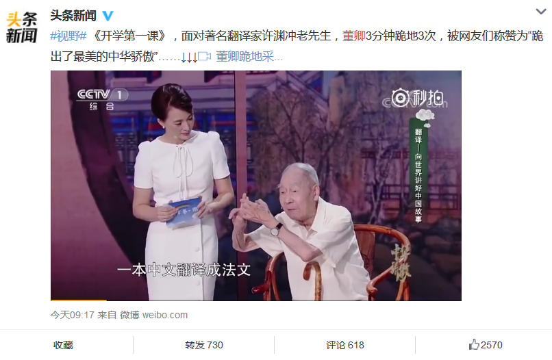 在节目《开学第一课》中,董卿面对照顾轮椅上的老人,即使穿裙子,她还是选择跪地采访。