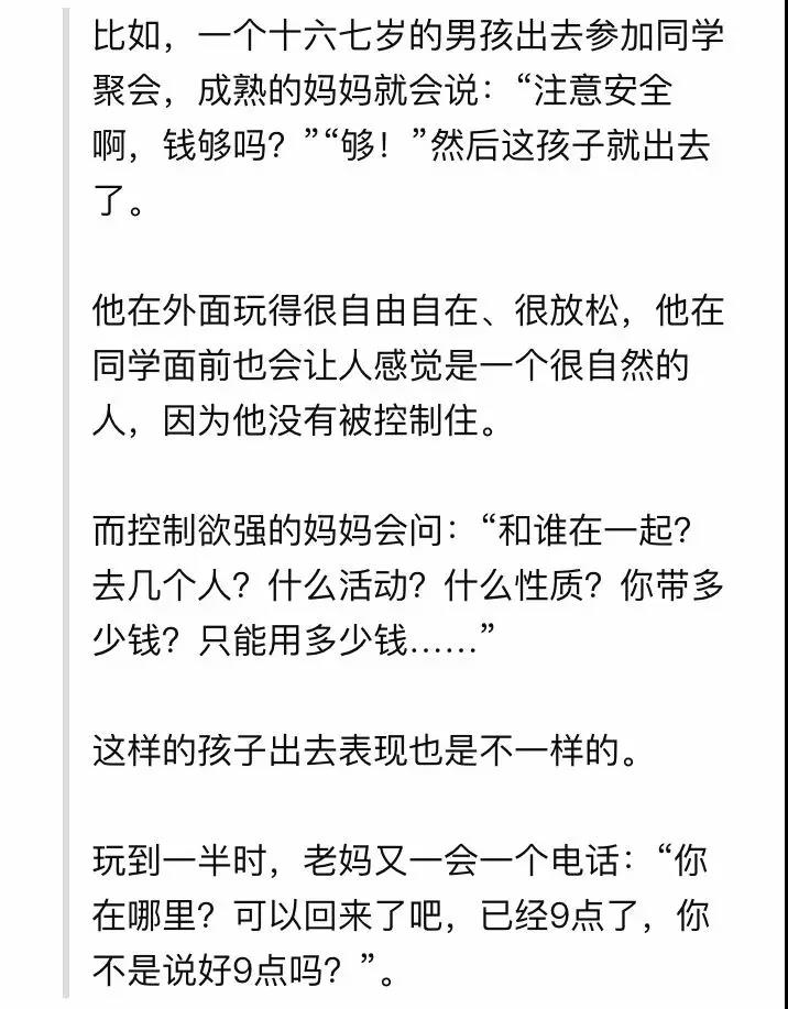 我所看到的幸福的家庭,都是没有一个人控制欲很强的,每个人都相对独立,自己完成自己的事情。好的家庭就是这个样子,但是好的家庭的比例越来越低了。