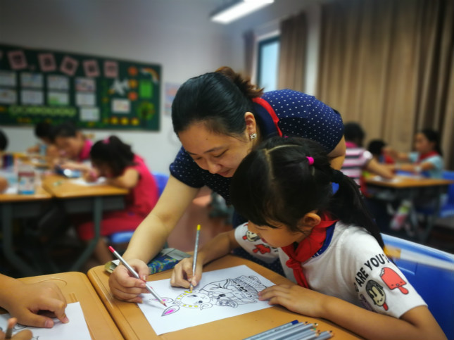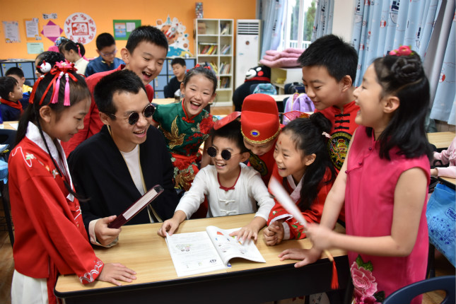 ▲ 世外小学数学老师龚豪与孩子们一起穿上中国元素服装,在数学课上分享节日的故事。