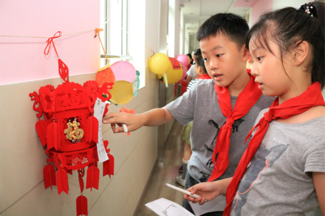 ▲徐汇区建襄小学的学生们自己制作了灯笼,开展猜灯谜活动。