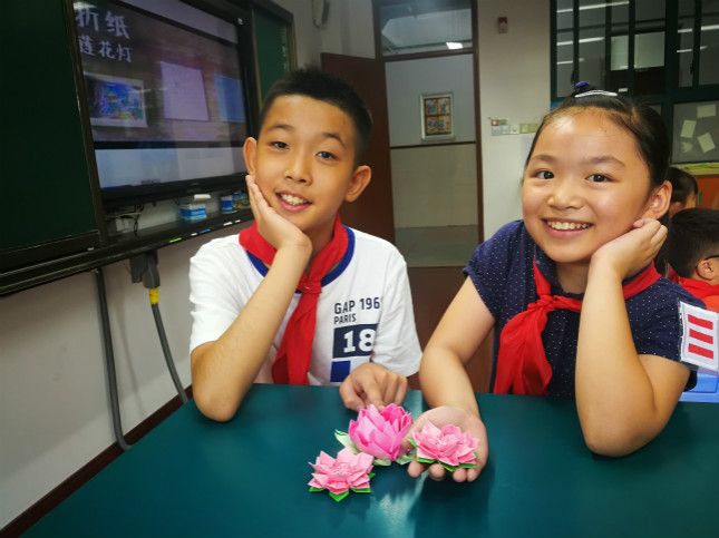 ▲ 杨浦区二联小学的学生们身穿汉服,制作“祈福莲花”