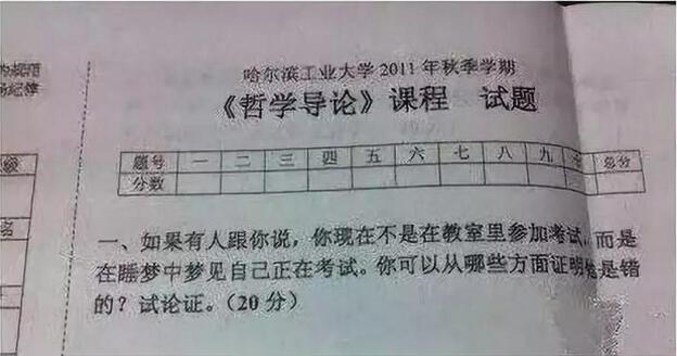 哈尔滨工业大学就更绝了,试卷第一题就让考生论证:如果有人跟你说,你现在不是在教室里参加考试,而是在睡梦中梦见自己正在考试。你可以从哪些方面证明她是错的?