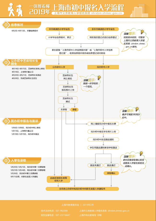 2019年2月底,各区将公布义务教育学校招生工作实施方案。3月中旬,各区将公布公办小学招生划片范围、公办初中入学方式、体育艺术特长生招生计划等具体信息,相关公办小学也将公布包括入学排序细则在内的招生入学通告(方案)。