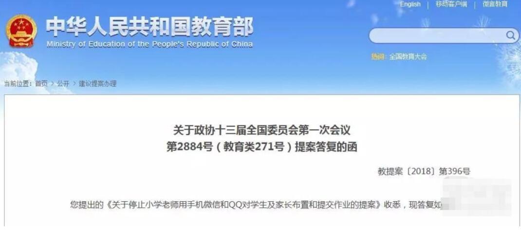 2018年全国两会期间,有政协委员提出《关于停止小学老师用手机微信和QQ对学生及家长布置和提交作业的提案》,教育部公布提案办理情况。