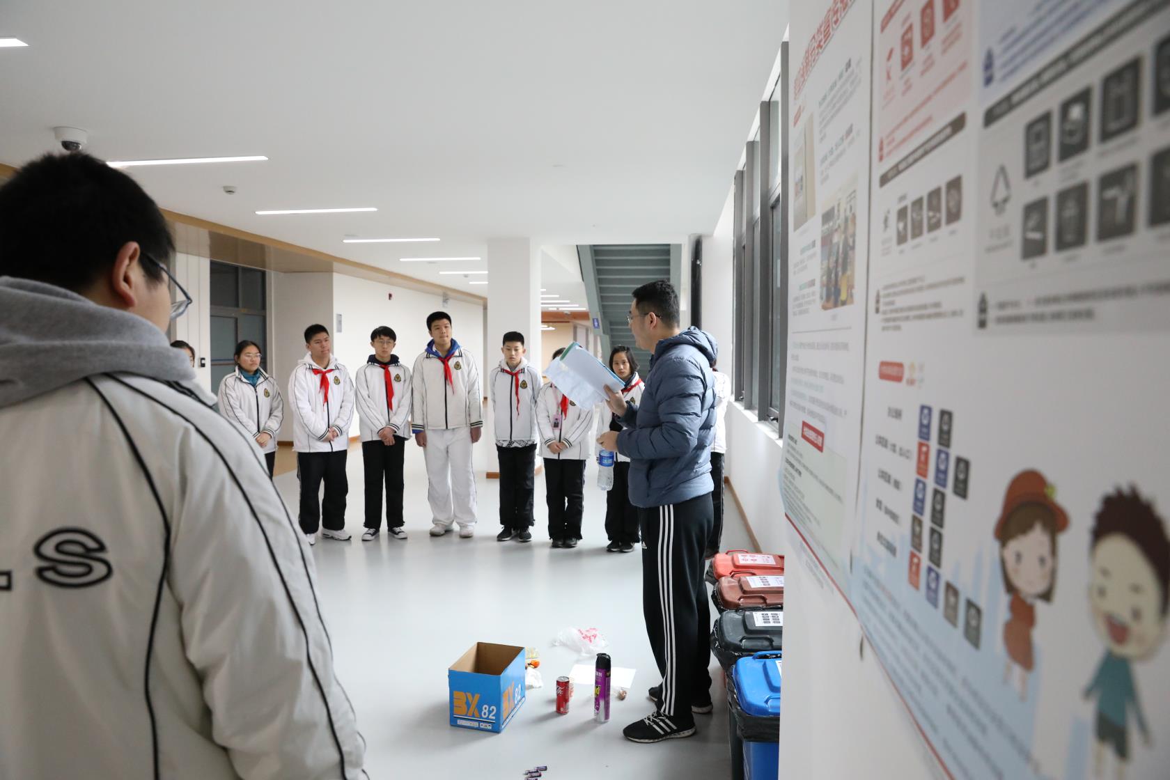 “如果你把菜打翻在报纸上,应该怎么处理垃圾?”“塑料袋里装着蛋壳,属于哪种分类?”开学典礼正式开始前,一场特别的“垃圾分类小课堂”正在上外附中东校教学楼一楼大堂上演。20个学生围成一个半圆,站在“圆心”的安全老师举着塑料袋、矿泉水瓶等常见物品,为大家分析讲解垃圾分类的常识和场景。