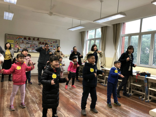 ▲在汇师小学,孩子们和家长在老师的带领下一起做运动