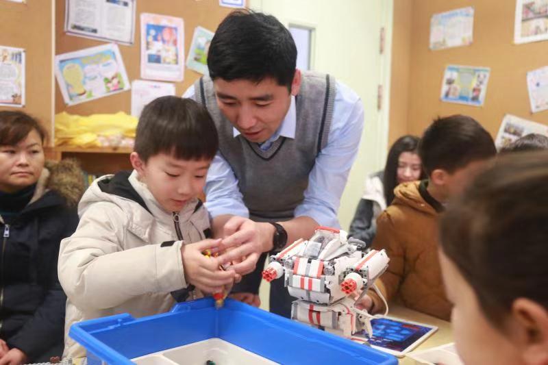▲浦东新区梅园小学,孩子们体验机器人课程