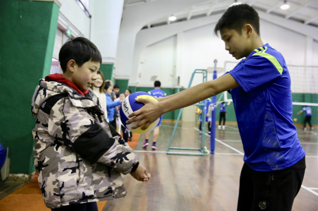 ▲同学们正在杨浦区新大桥中学体验排球课。陆嘉辉 摄