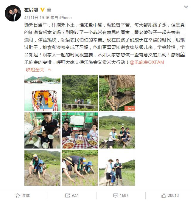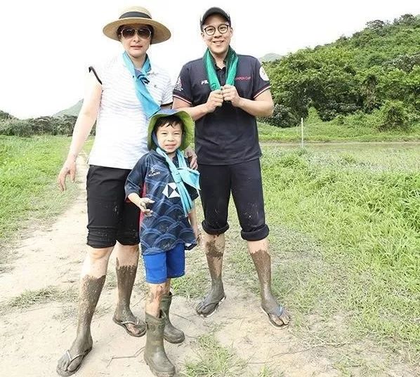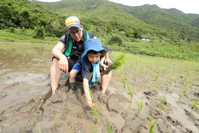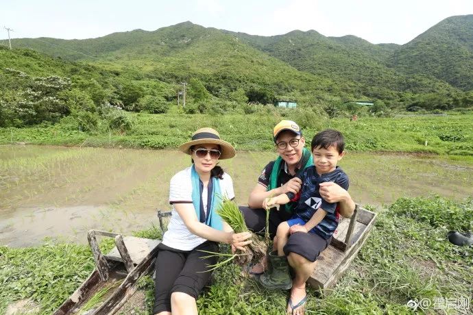 前几天,霍启刚在微博晒出一组照片,是他和郭晶晶带儿子霍中曦到农田体验插秧的场景。
