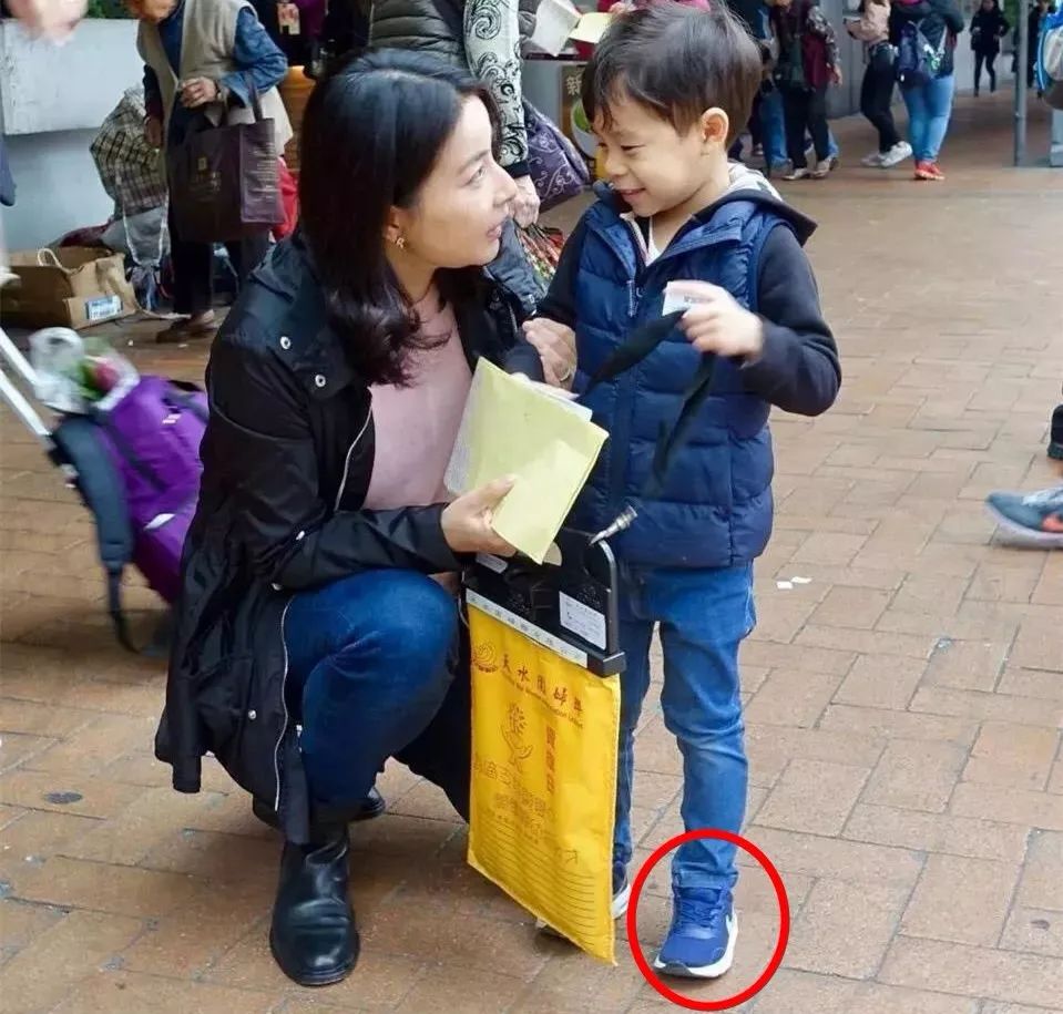 儿子4岁时,带他去地铁站,帮妇联义卖筹款。