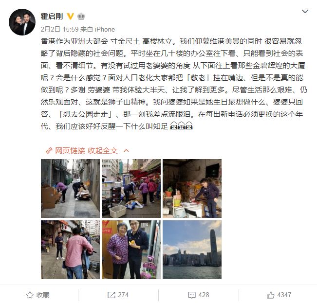 今年2月霍启刚和老人一起收垃圾的举动就打动了很多人。