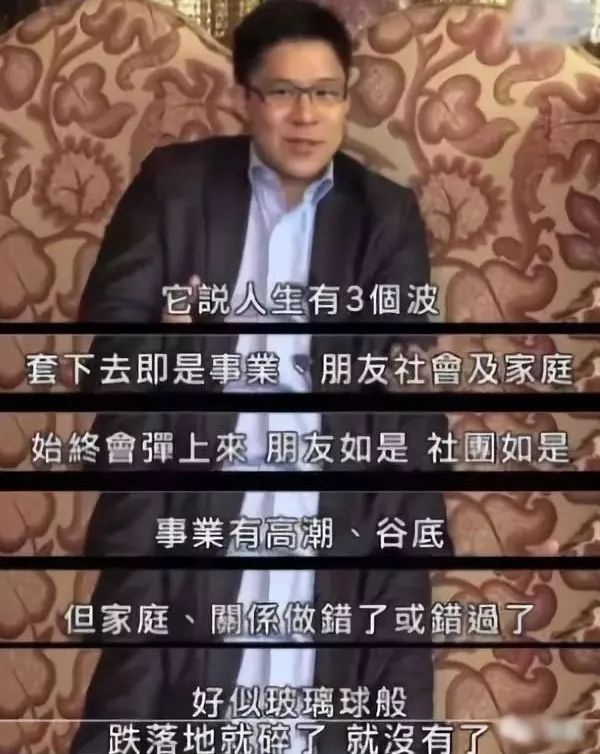 “人生有3个波,即是事业、朋友、及家庭。始终会弹上来,朋友如是,事业如是。但是家庭关系做错了或错过了,好似玻璃球般,跌落地就碎了,就没有了。”
