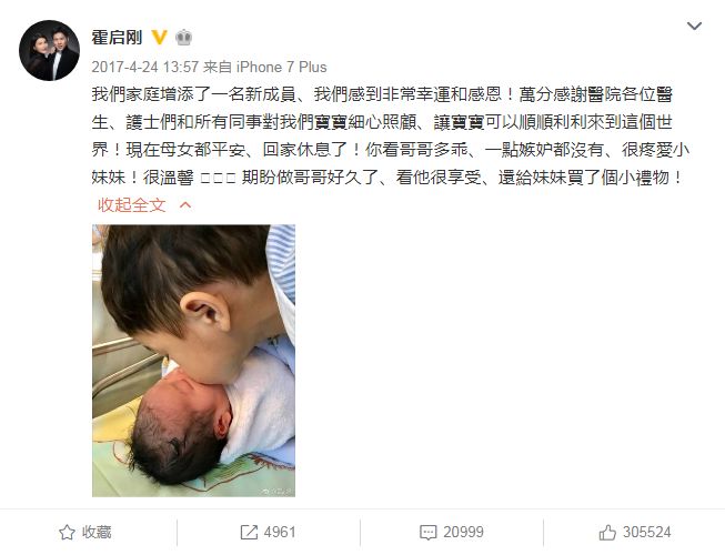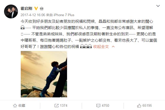 霍启刚发微博说:“你看哥哥多乖,一点嫉妒都没有,很疼爱小妹妹,很温馨,期盼做哥哥好久了。”