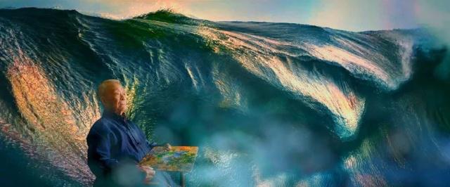 周令钊一手拿照片、调色板,一手握画笔,再一次爬到了巨幅画像前。