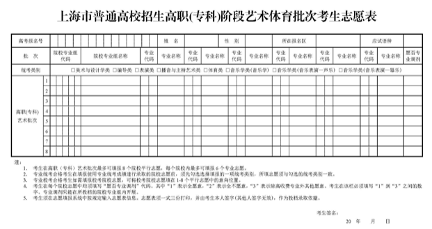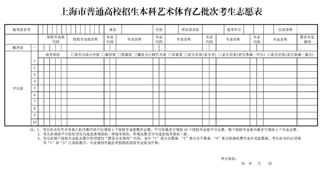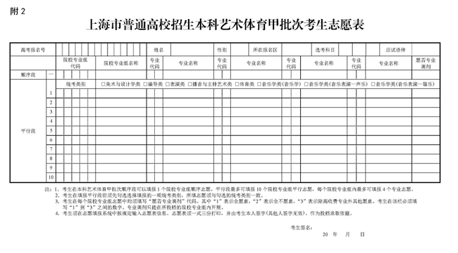 附2. 上海市普通高校艺术体育类专业考生志愿表: