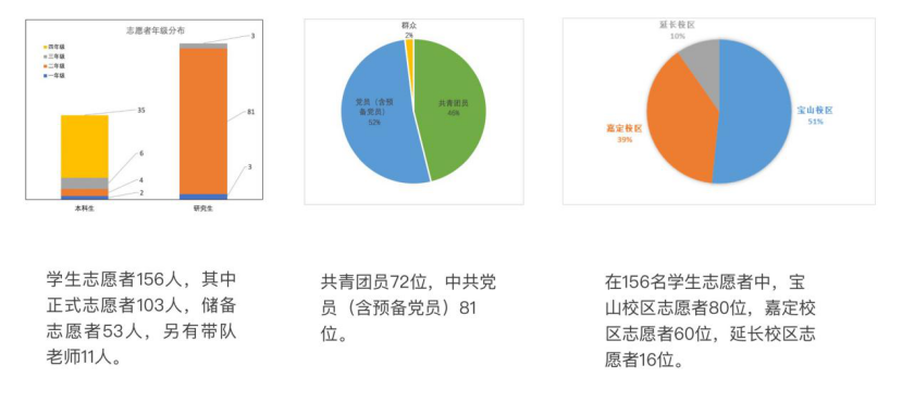 今年,上海大学共有来自156名优秀志愿者,其中研究生113人,本科生43人,其中,拥有首届进博会志愿服务经历的5人。志愿者分别来自上大宝山、延长、嘉定校区,距离进博会所在的四叶草场馆分别有34公里、28公里、32公里。