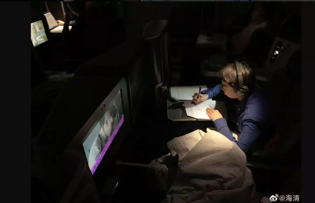 为此,海清发了一条微博吐槽:坐长途飞机,快夜里12点了,蛋妞还在赶作业。