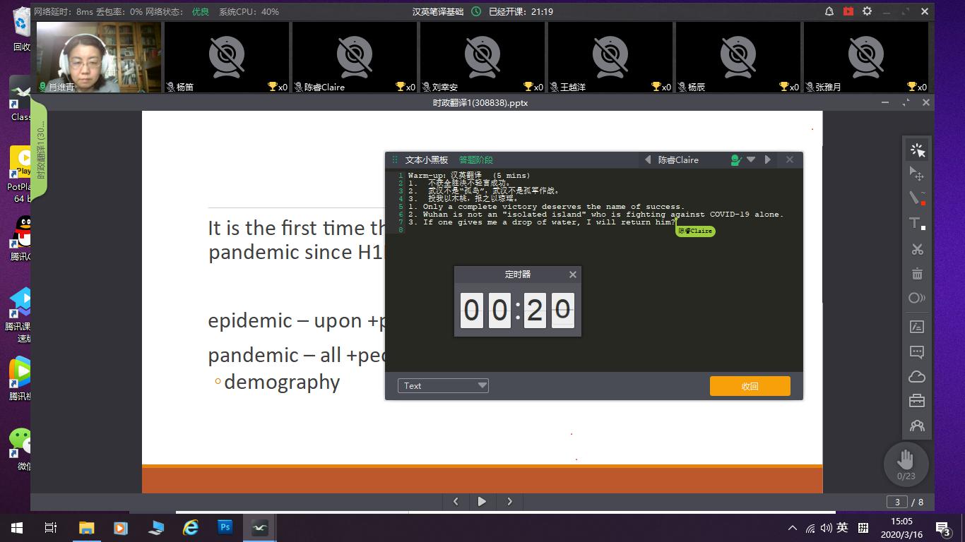 不少如“疫情无国界,人间有真情”“不获全胜決不轻言成功”等时政金句成为师生讨论的焦点。该门课程的任课老师肖维青表示,将时下的金句热词加入到课堂中,一方面是希望大家关心时事,了解社会热点,另一方面可以加深对专业知识的透彻掌握,更重要的是,鼓励大家今后能用自己的专业所长为国家服务。