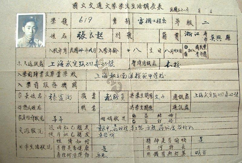 1944年底,濒临失败的日军作最后的反扑,重庆岌岌可危,当时在重庆交大张良起毅然报名参军,最终因为体检没有通过。如今这张报名表还留在上海交大的档案馆。