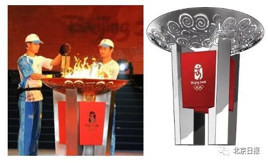 飞舞的红色丝带环绕在火种灯顶部,与火炬“飞扬”视觉形象统一,象征着拼搏的奥运激情。方圆嵌套象征天圆地方,银色金属光泽和晶莹剔透的玻璃形成对比,表达了中华民族优秀传统文化与奥林匹克精神的完美契合。