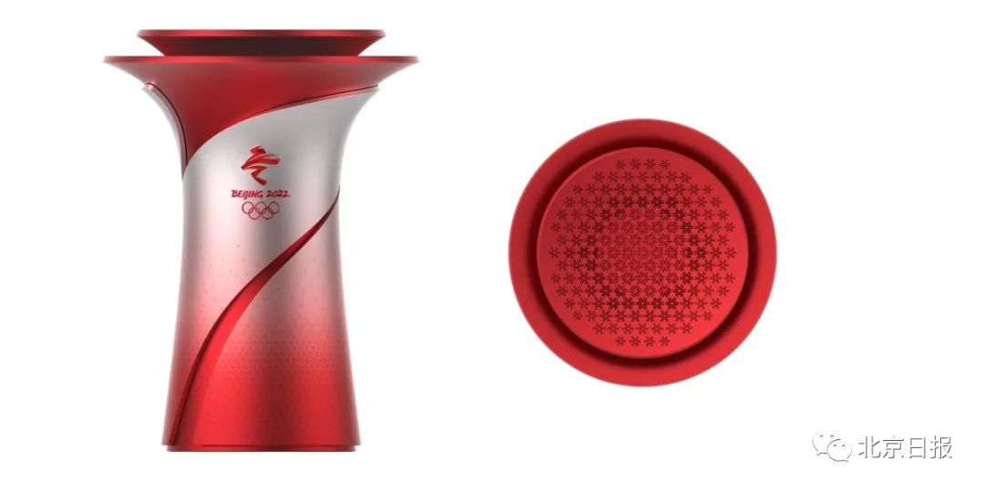 祥云纹路由下而上渐化为雪花,象征了“双奥之城”的精神传承。红色丝带飘逸飞舞、环绕向上,与火炬设计和谐统一。红银交映的色彩,象征了传统与现代、科技与激情的融合。