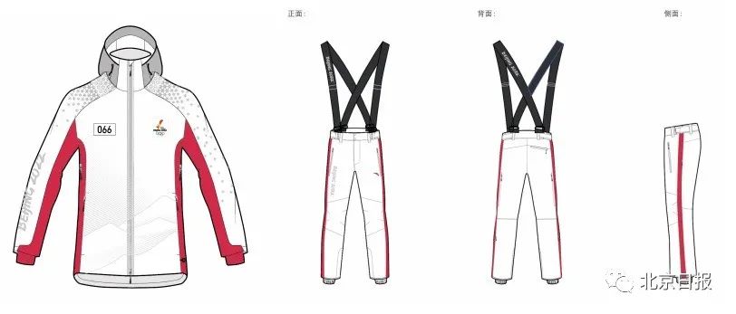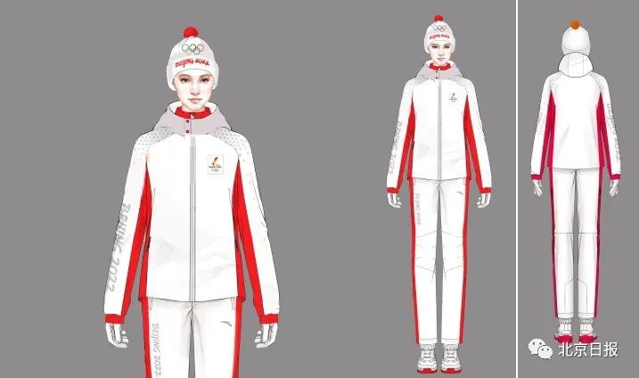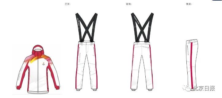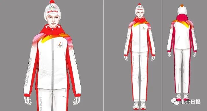 全套制服包括服装、针织帽、头带、手套和运动鞋。颜色选配上,主色取自火焰的红黄两色,并在白色主基调的基础上突出中国红的色彩,并衬以黄色,体现激情、热烈、欢庆的火炬接力特点,从袖口、身侧直达脚底的红线与火炬对接成完整的线条,形成动感,充分展示火炬手追逐前行的昂扬姿态。面料选择上,兼具抗静电、超强透气、速干、防水以及抗菌功能。