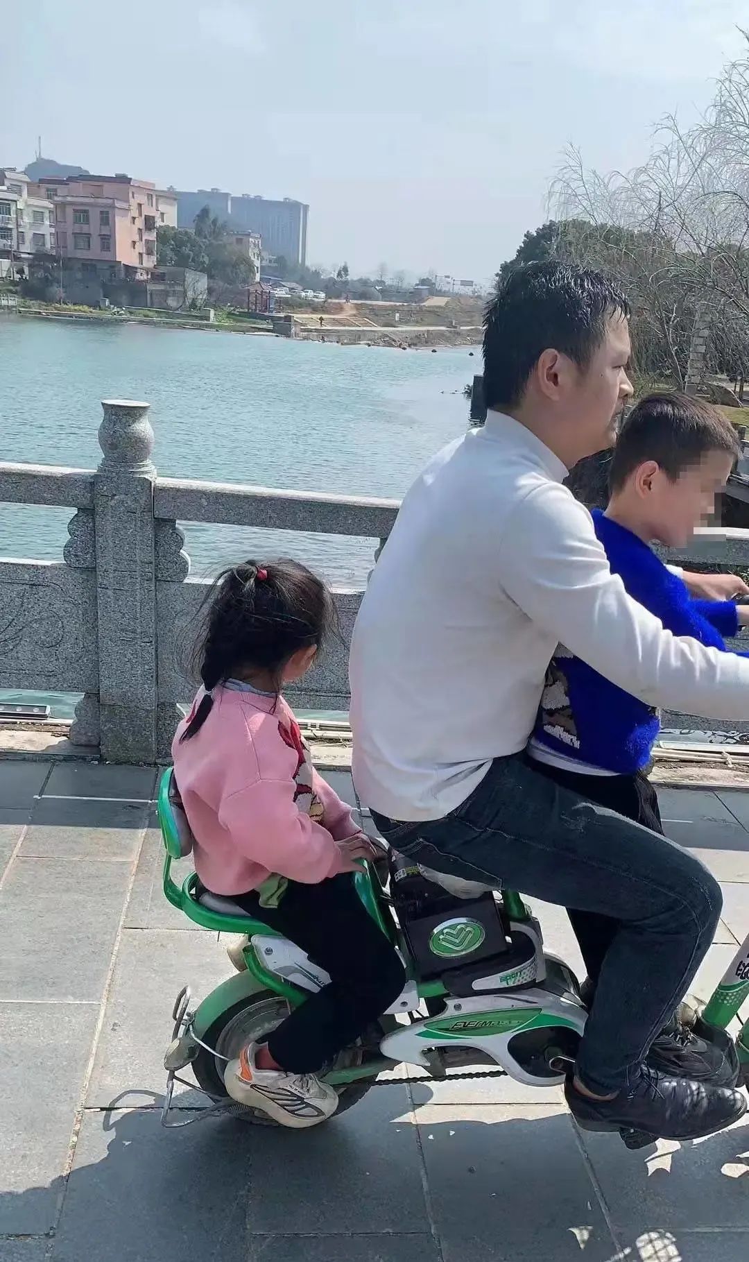 ▲救人后,毛少霆骑车载着儿女回家(胡金翠摄)