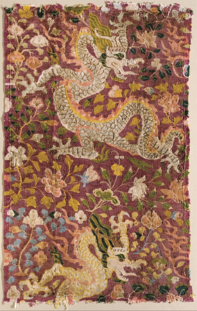 龙与花卉图案挂毯,11—12世纪,中亚。这条丝毯上的龙意味着中国唐代的图案至元代仍在中亚地区流行,将龙置于花卉之中的处理则更像是一项中亚的发明。