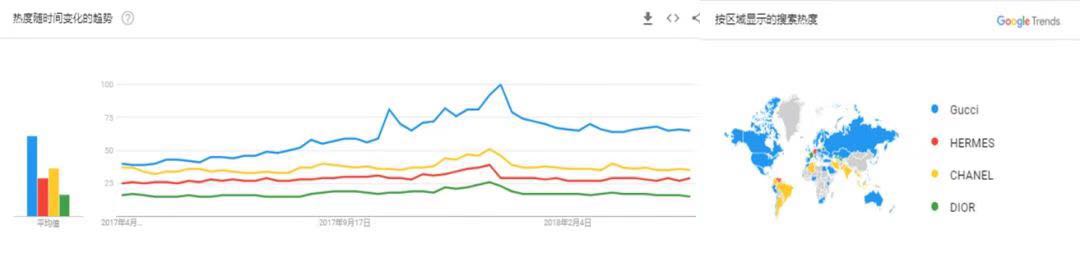这些传播带来什么效果?在谷歌趋势(Google Trend)的比较结果中可见一斑:你看到的所有蓝色,都是Gucci。