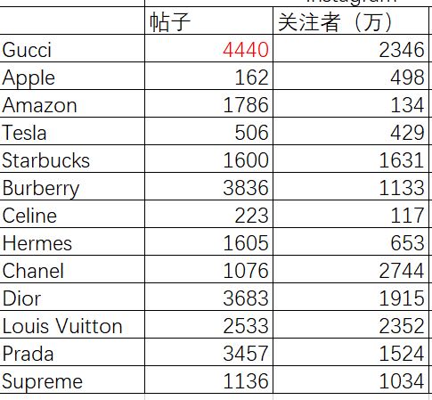 为了向大家展示Gucci对使用社交媒体的热衷,我在Instagram上面采集了一些简单的数据。作为参照,我放了全世界品牌价值最高的电子产品品牌Apple、大众时尚零售品牌Starbucks、多次被总统点名批评的网红电商Amazon,以及那个老板还鼓捣火箭发射的电动汽车品牌Tesla: