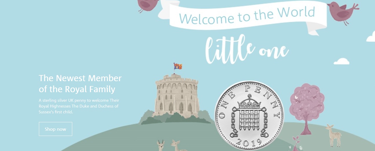 英国皇家造币厂已经在首页大打广告——“庆祝萨塞克斯公爵和公爵夫人迎来第一个孩子”,借此喜事为造币厂的一便士新生儿纪念币“蹭热点”。(Celebrating the Birth of The Duke and Duchess of Sussex’s First Child 2019 UK Silver Penny)